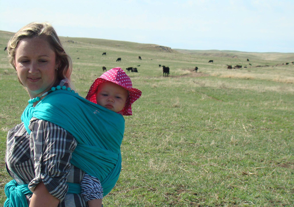 I was born and raised ranching. It’s all I know. I want to pass the love I have for agriculture on to my daughters. I want my children to respect, have compassion, and understand livestock. It sure is something to watch my 5 month old daughter get her little arm wiggled out of the wrap (on my back) just to feel and interact the goat as I milk her. My babies are learning valuable life lessons at the youngest of ages…always safely of course! Babywearing has allowed me to share a special bond with my children and to continue to do my small part around the ranch. In my opinion babywearing isn’t only a necessity, but a privilege.